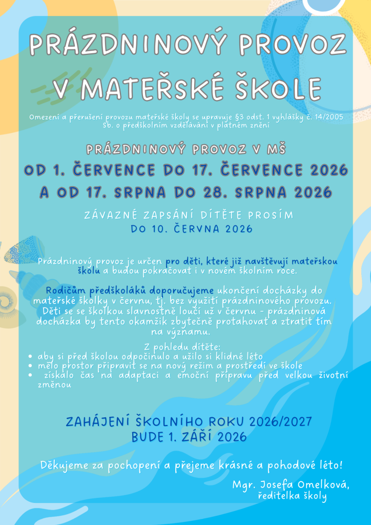 Rodičům předškoláků doporučujeme ukončení docházky do mateřské školky v červnu, tj. bez využití prázdninového provozu. Děti se se školkou slavnostně loučí už v červnu - prázdninová docházka by tento okamžik zbytečně protahovat a ztratit tím na významu.