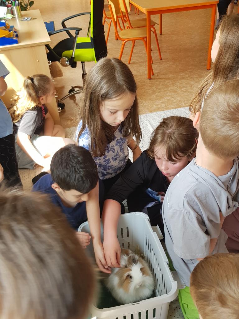 Děti byly nadšené z papouška, pomazlily se s křečkem a králíčkem, seznámily se s pavoukem, africkým šnekem, andulkou a rybičkou (sumečkem). Také jsme si hodně povídali o psech a kočkách, protože tyto zvířátka zpravidla děti mají doma. Přečetli jsme si nové informace z říše zvířat. V průběhu týdne děti soutěžily, plnily vzdělávací úkoly a pracovní listy. Hráli jsme také postřehové a úkolové hry. Společný čas se zvířátky děti velmi bavil.