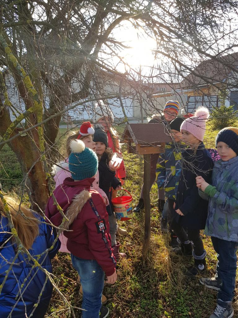 Ptáčkům je v zimě potřeba plnit krmítka, aby měli kde doplnit své síly. Proto se s dětmi v zimním období staráme o ptáčky tím, že chodíme sypat směs semen do krmítek.