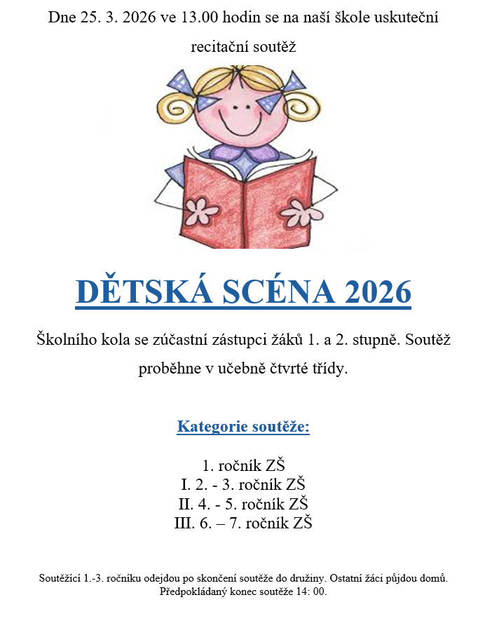 Soutěžící 1.-3. ročníku odejdou po skončení soutěže do družiny. Ostatní žáci půjdou domů. Předpokládaný konec soutěže 14: 00.
