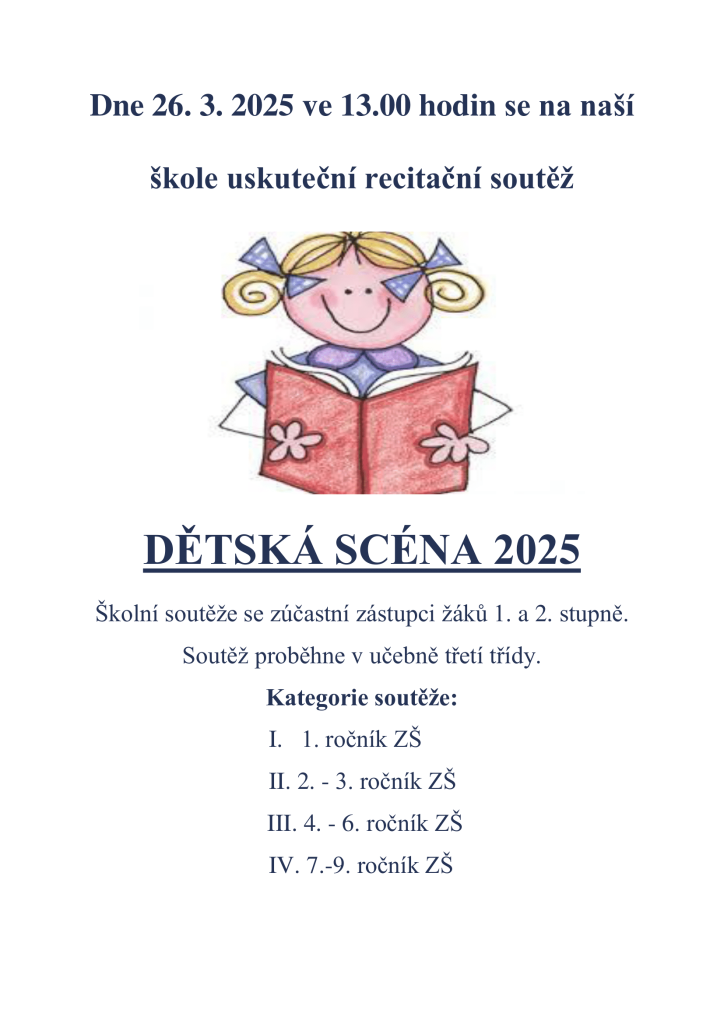 Dne 26. 3. 2025 se na naší škole uskuteční recitační soutěž Dětská scéna.