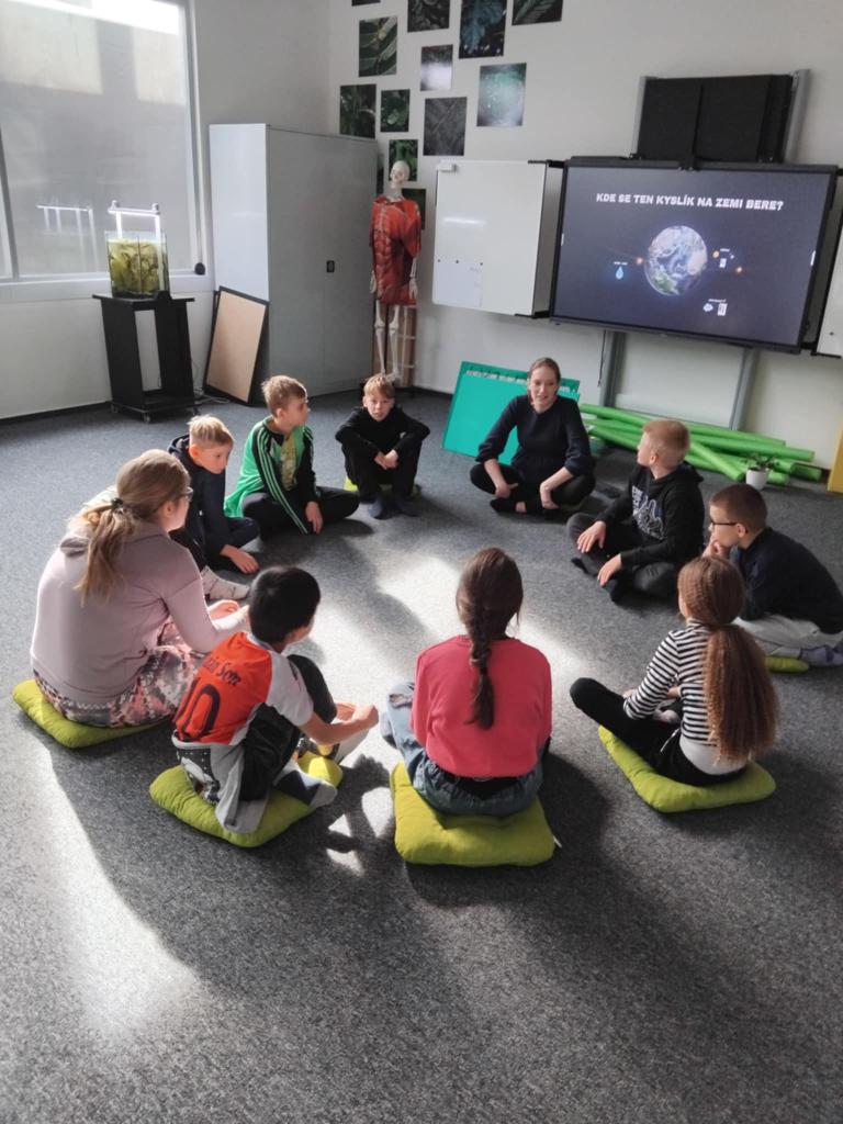 Pozorovali vodní rostliny v akváriu, hráli pohybové hry znázorňující dění v rostlinách, tvořili vlastní schéma fotosyntézy a prohlédli si model buňky a chloroplastu. Pracovali ve skupinkách a sdíleli své poznatky při evokaci a reflexi.
